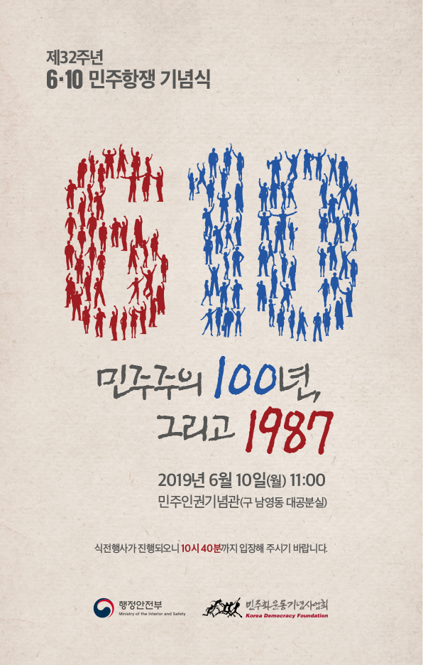 서울(의왕)--(뉴스와이어) 2019년 06월 07일 -- 6월 10일(월) 오전 11시 민주인권기념관(옛 남영동 대공분실)에서 행정안전부가 주최하고 민주화운동기념사업회가 주관하는 ‘제32주년 6·10민주항쟁 기념식’이 민주화운동 관련 인사 및 진영 행정안전부장관, 각 당 대표 등 정관계 인사 400여명이 참석한 가운데 개최된다.