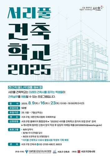 서울 서초구(구청장 전성수)가 미래 건축가를 꿈꾸는 지역 내 청소년을 대상으로 '서리풀 건축학교'에 참가할 학생들을 7월까지 모집한다고 밝혔다.