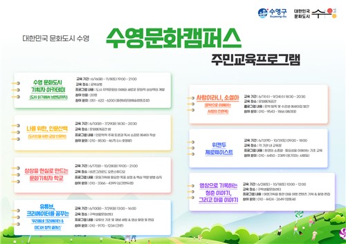 교육 신청은 수영구 주민뿐 아니라 수영구 내에서 활동 중인 생활인구 등 누구나 신청할 수 있으며, 6월 1일부터 프로그램별로 순차적으로 접수하고 있다.